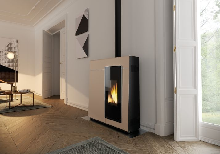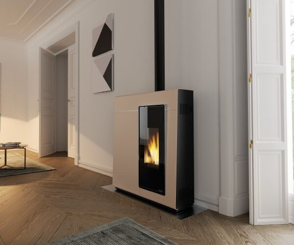 Estufa Salvaespacio estanca con salida de humos superior coaxial. Revestimiento de acero pintado con incrustaciones de acero niquelado.
